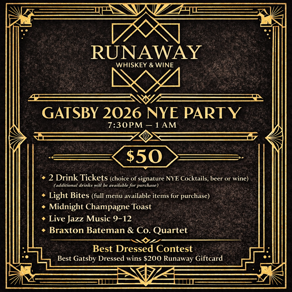 Discover Runaway Whiskey & Wine, Charlotte's premier 1920s-inspired speakeasy bar. Located in Wesley Heights, we specialize in craft cocktails, exclusive espresso martini flights, and a curated selection of whiskeys and wines. Enjoy our delectable small plates in a chic art deco ambiance, perfect for date nights, private events, and gatherings. Join us for an unforgettable experience in the heart of Charlotte.